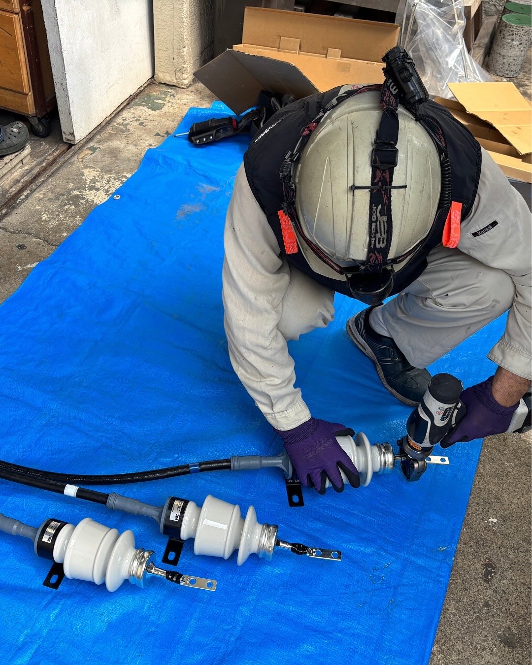 高圧受電設備では、ケーブル端末の処理精度が信頼性を左右します。この作業は、高圧ケーブルの端末を正しく処理し、電気を安全に流すための大切な工程。